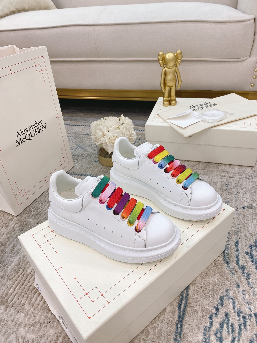 Rainbow corns ?? Alexander McQ?23ss classic white sneakers, made by McQueen for six consecutive years, the newly upgraded version is available at the counter simultaneously The latest original top-tier version developed this year - the couple version ... ?? McQueen M, CQ, as ALWAYS exclusive mold fabric material, LOVE to put down, correct fit, absolutely wonderful to wear, super COMFORTABLE ?????? Our company may not be the earliest to produce bulk goods, but we have always been providing you with the best quality products. We are dedicated to making the best quality! McQueen's top purchasing version for spring, summer, autumn and winter ... ? Classic + FASHION + VERSATILE + GRAND + ELEGANT + HIGH FASHION ???? STAR PREFERRED, ONE of the essential, many color options ??? ?? Fabric: Exclusive molded beige imported silk cowhide The upper of the shoes is custom-made with imported anti-stain features. TPU+PU anti-yellowing. Super strong sense of temperament ?? Lining: imported grade A water-dyed sheepskin (price equal to cowhide lining) ?? Sole: Counter original mold rubber TPU sole The thick-bottomed 4.5cm men's and women's grinding tools have different lasts ?? with counter original publication (original beige shoebox.) Cloth bag. Handbag. 4-piece set with 1:1 mold for matching certificate. Deliver a pair of shoelaces ?? For men and women size: 35-40 for women and 39-44 for men 102032 [Male size plus 10] Note: Special sizes: Female 34.40.41, male 38.45.46. Custom-made available. Return. Exchange McQueen's tail has too many colors. Special style, special color, special tail. The air cushion series Velcro is custom-made and non-returnable. It's normal for the tail fabric of the colored style to have some differences in light and dark colors. Thank you [handshake][Handshake][Handshake]