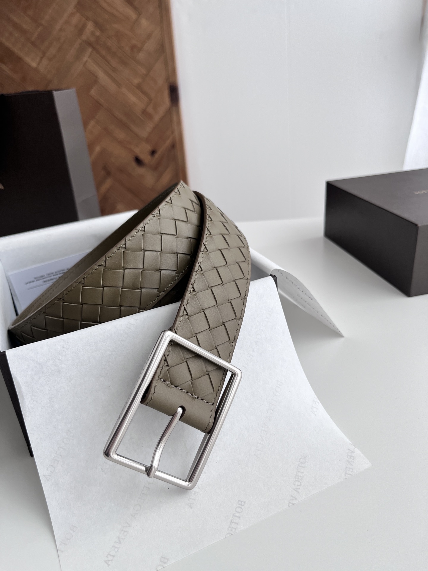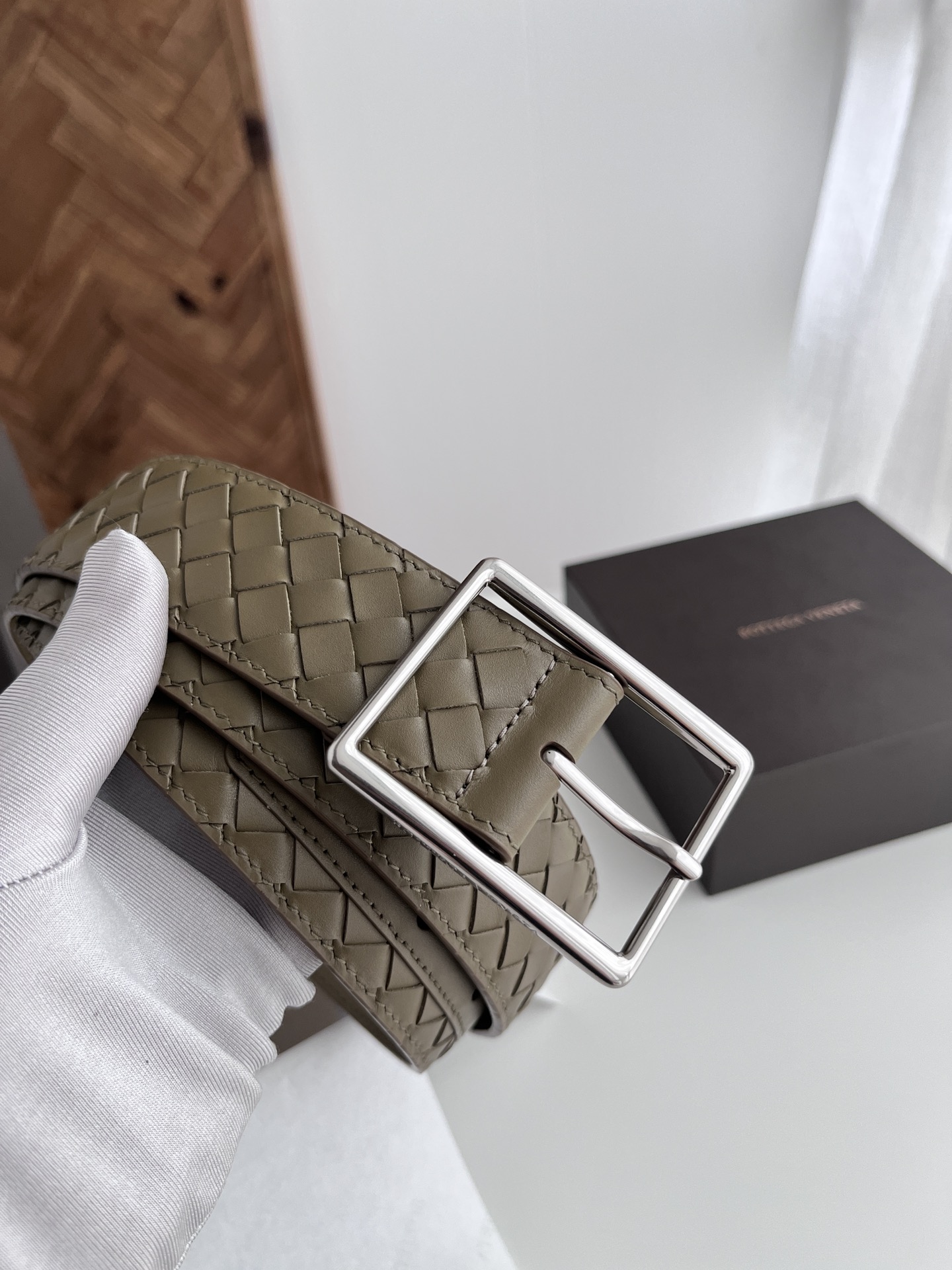 BV top-quality 2024 new wide men's belt, handcrafted with small checkered intrecciato piccolo braided Italian calfskin, paired with slightly retro silver pin buckle holes. Newly designed belt width 4.0cm. Color: military green