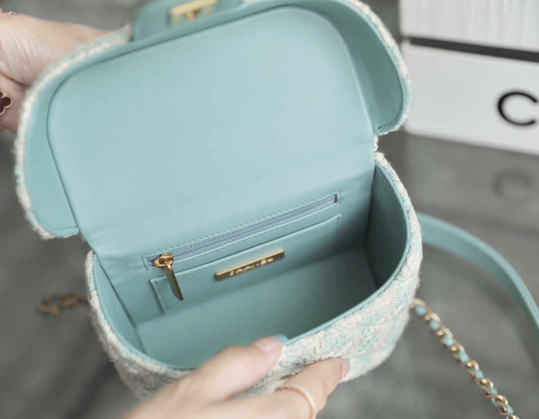Brand NEW ARRIVAL ?????????????? ?????? Spring/summer tweed Youdaoplaceholder0 Small ring makeup bag light blue/off-white Counter price ???????????????? Purchase ?? Development Youdaoplaceholder0 Who can refuse ???????????? tweED makeup bag Light and DELICATE TOUCH THAT IS JUST TOO COMFORTABLE ?? Diamond-patterned vintage double ?? clasp, wrist with two ???????? rings ? It is both unique and sophisticated, simply an artistic handicraft. Metal: thick-plated ?????? gold buckle Leather material: Tweed/lambskin Size: ????*????. Youdaoplaceholder2 *?? ????