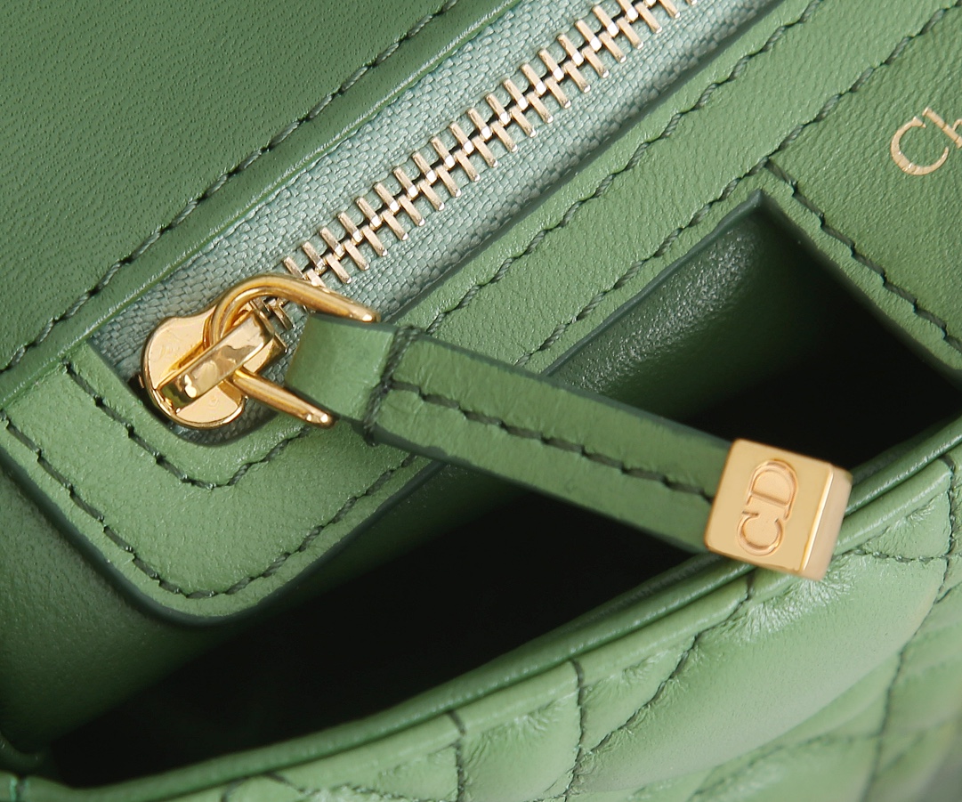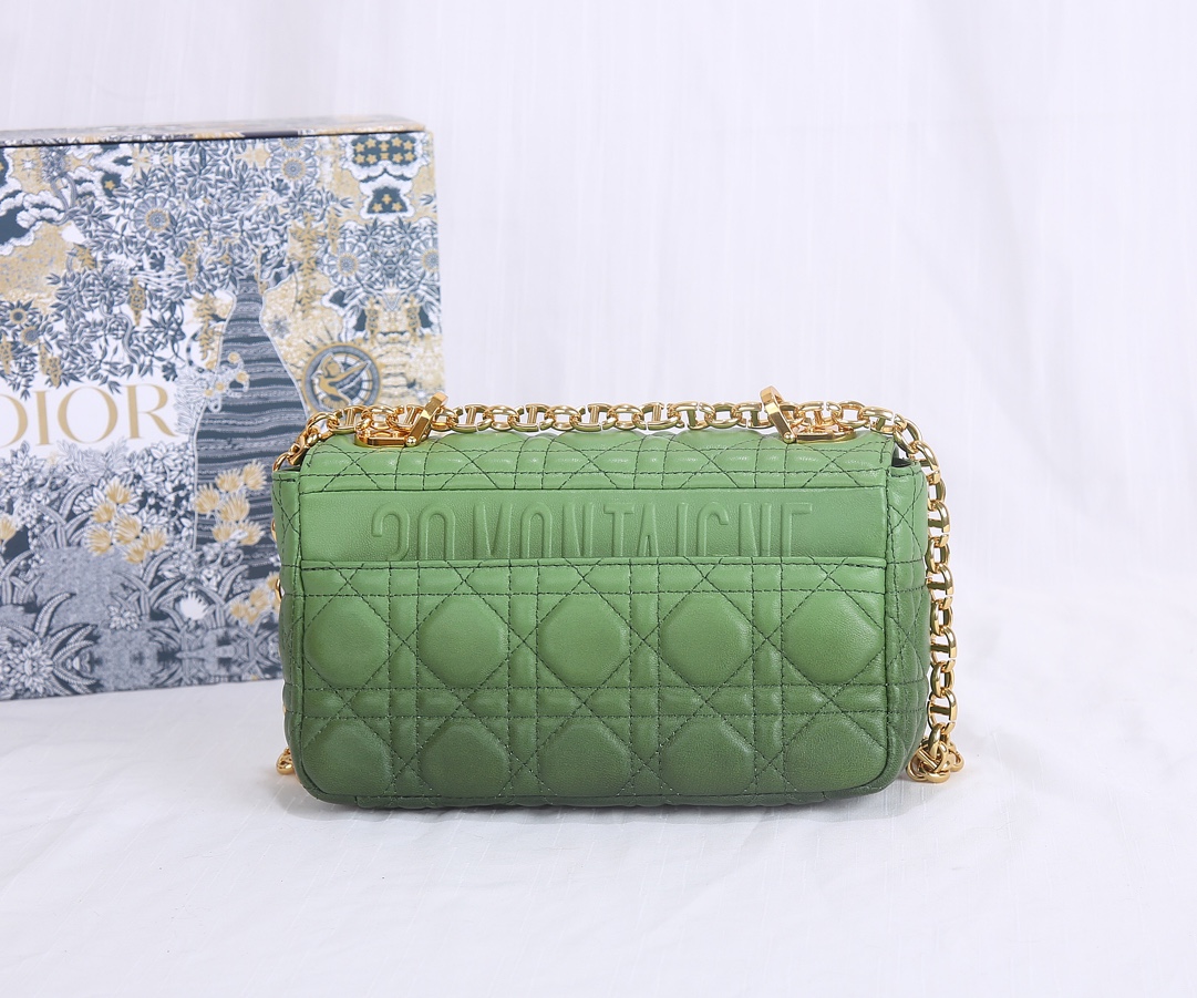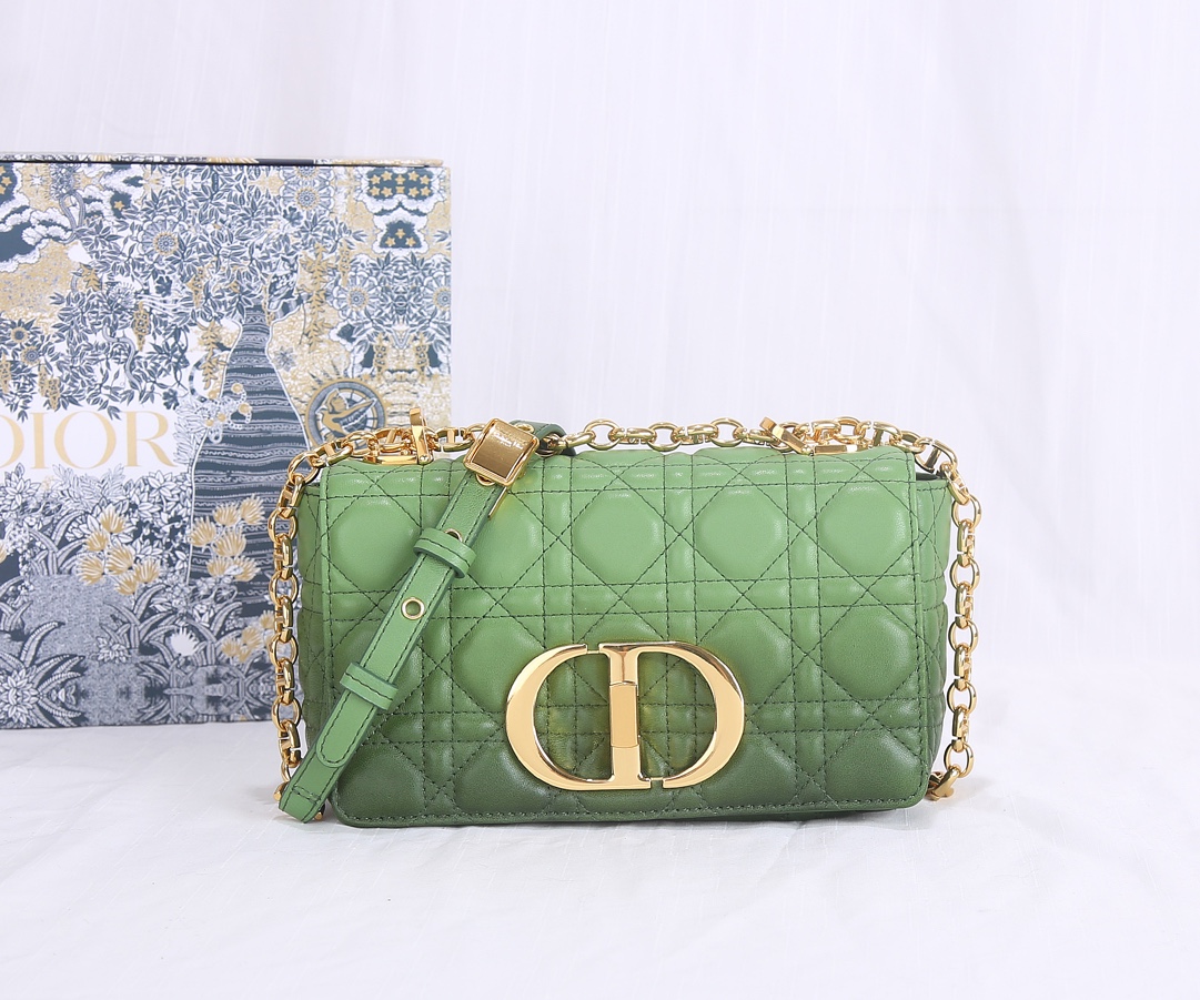 The inner lining of the Dior trumpet is made of imported sheepskin with a gradient color The Dior Caro handbag is elaborately crafted from green cowhide and decorated with the signature rattan checkered stitches. The material is soft. The flip cover is decorated with a retro gold finish metal "CD" clasp, inspired by the seal of Christian Dior perfume bottles. The small-sized style comes with a detachable signature "CD" chain shoulder strap, which can also be replaced with an embroidered wide shoulder strap for a more elegant and fashionable look. Whether it's a daily look or a dinner party Dimensions: 20x12x7CM