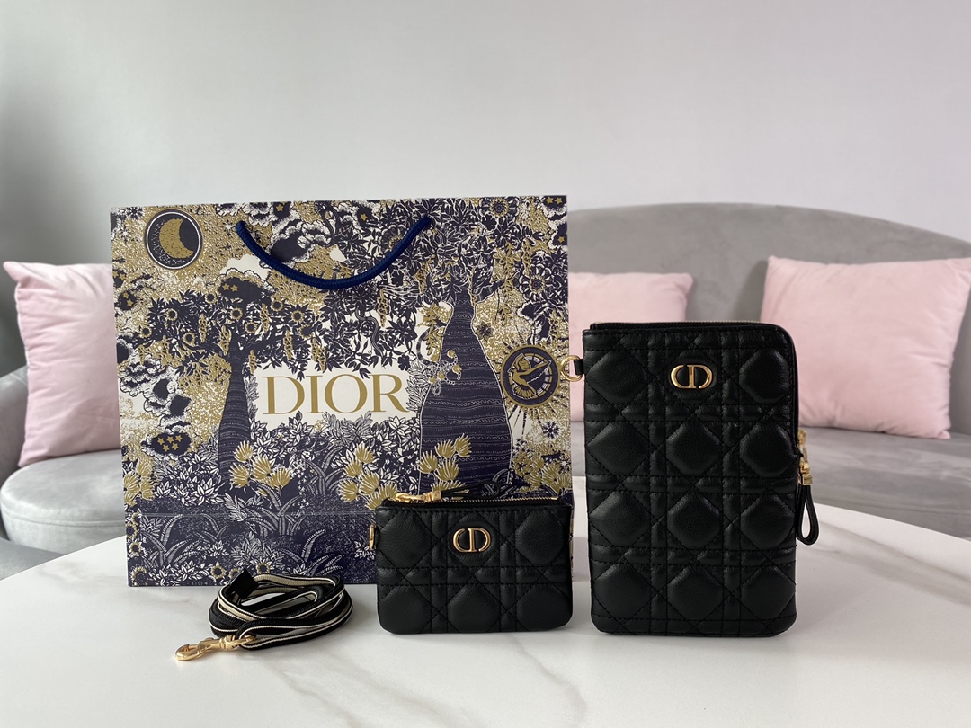 DIOR CARO multi-functional clutch bag Black, soft, top-quality original factory cowhide with rattan checkered pattern This Dior Caro multi-functional clutch is meticulously crafted from black soft cowhide leather, ingeniously integrating various elements and adorned with the signature rattan checkered stitching. It has two detachable parts and is equipped with a zipper. The small bag can hold cards, keys or cash, while the larger bag with more space can hold mobile phones. It comes with a detachable shoulder strap and can be carried diagonally, hung around the neck or put in a pocket. Black soft cowhide rattan checkered stitching The front is decorated with the "CD" logo "CD" logo zipper opening and closing One small pocket can hold cards, keys or cash One large-sized clutch can hold a mobile phone and has two card slots inside Detachable lanyard It can be matched with the characteristic thin shoulder straps of this series It can be held by hand, slung across the body or hung around the neck Dimensions: 18.5 x 12 cm and 12 x 7.5 cm