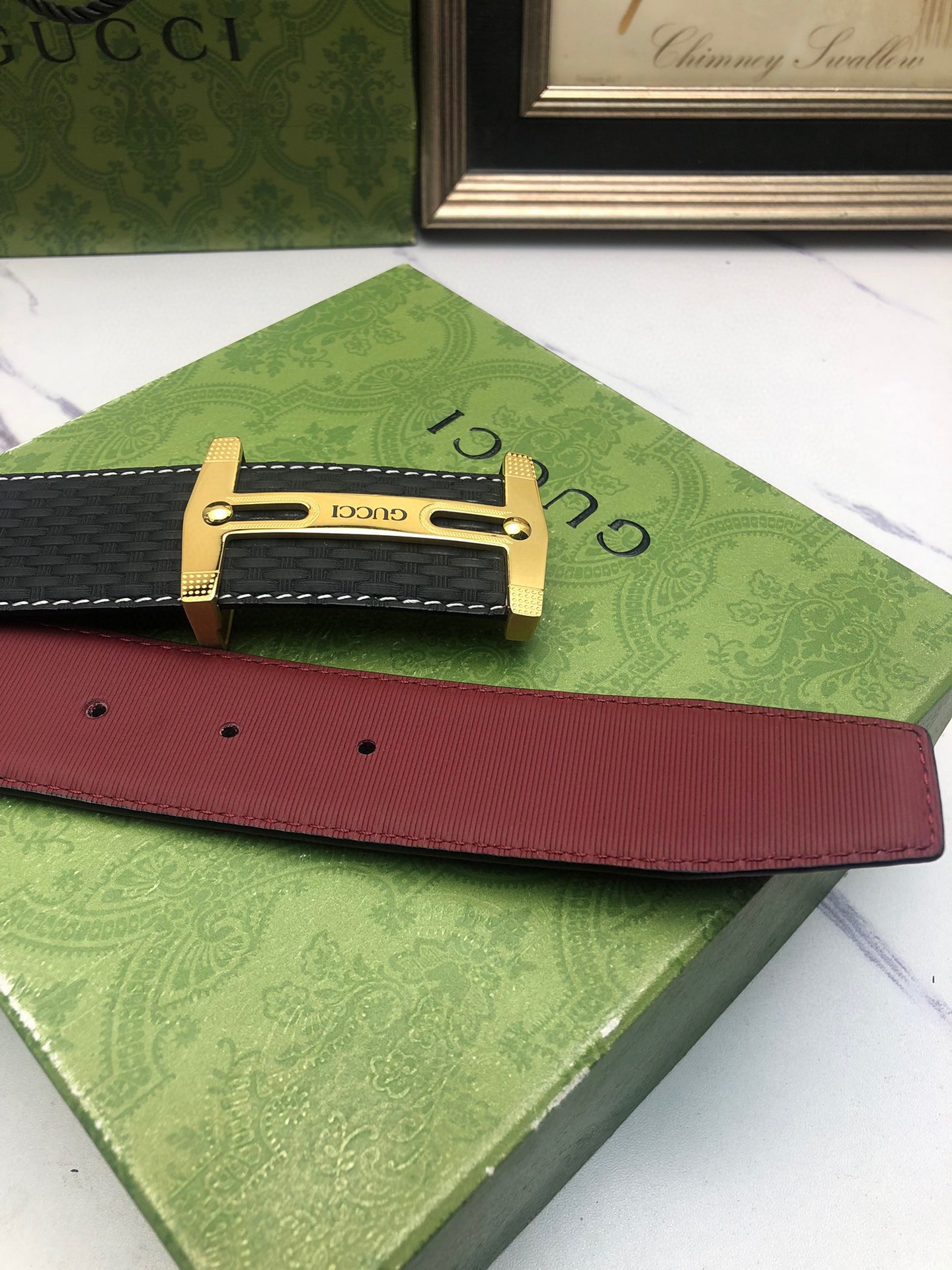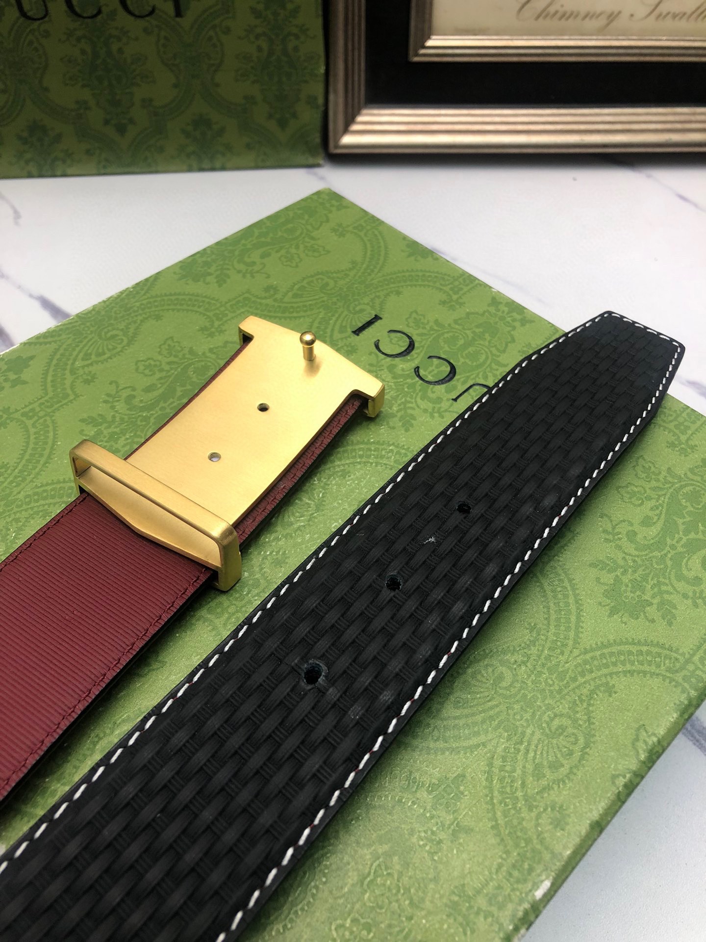 Gucci: Original single-grain calfskin with embossed patterns, lined with plain cowhide base, creating a woven appearance. Decorated with the original single buckle of the logo. The counter width is 4.0