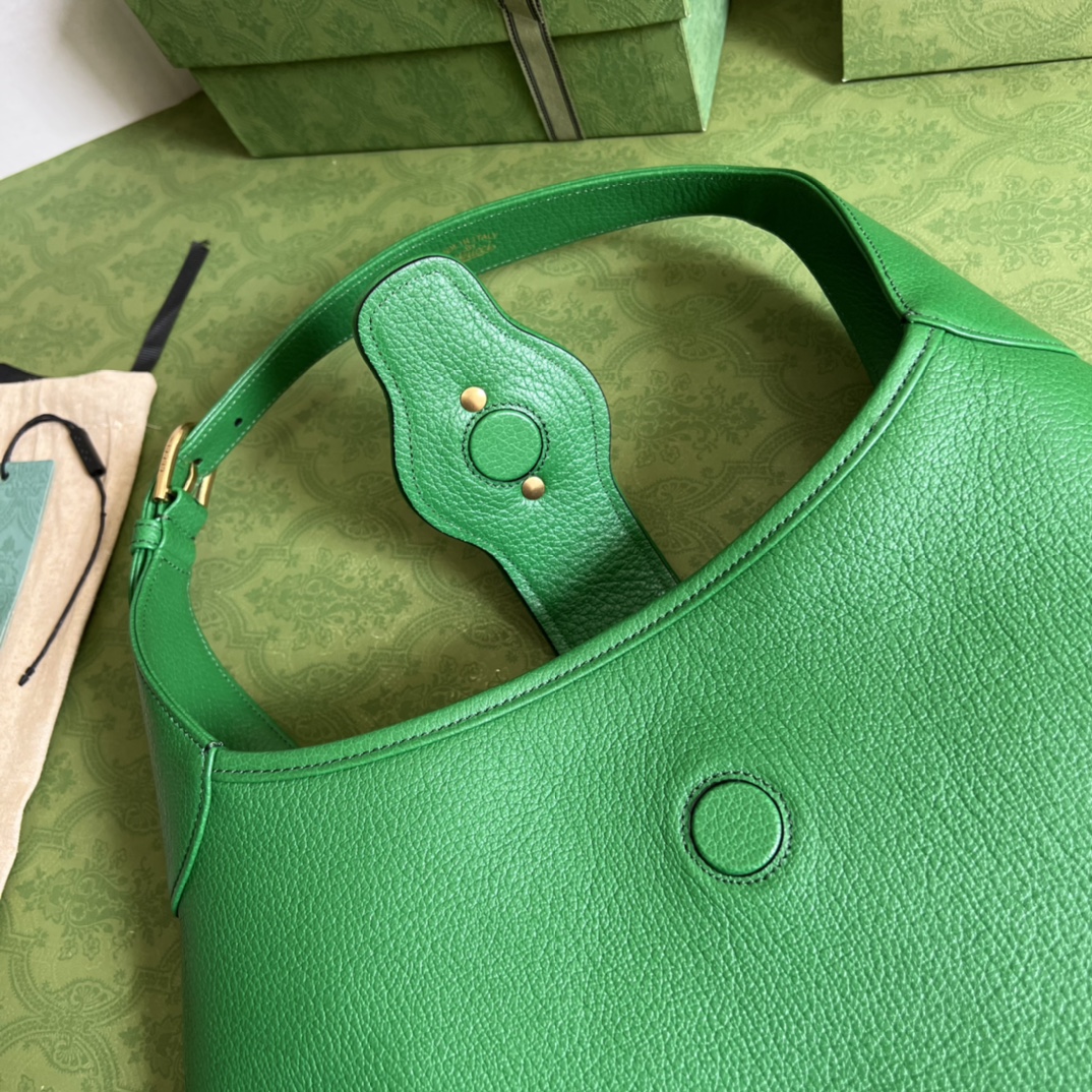 ??GG?? The Gucci Cosmogonie collection makes its debut at Italy 's historic Monte Castle. On the runway, aesthetic elements from different eras and geographical locations complemented each other, connecting the past with the present. This brand-new crescent-shaped shoulder bag is one of the runway items. It draws inspiration from the brand's classic elements, is presented in soft leather, and is decorated with the double G logo that made its debut in the 1970s. Green soft leather, shiny golden matching accessories. Inside: 1 zipper pocket. This handbag comes with an additional shoulder strap that can be fixed to the handbag with a clasp. The handle can adjust the shoulder strap and is decorated with double G magnetic clasp. Model: 726274 Dimensions: 39 (width) x 38 (height) x 2 (depth) Color: Green/Original factory leather.