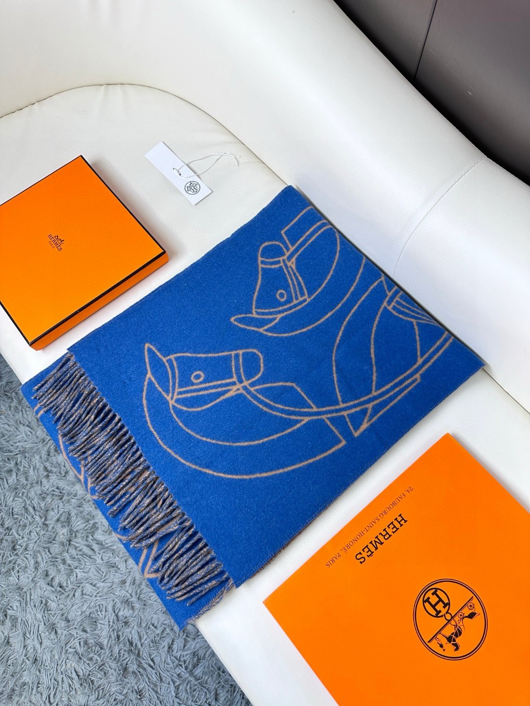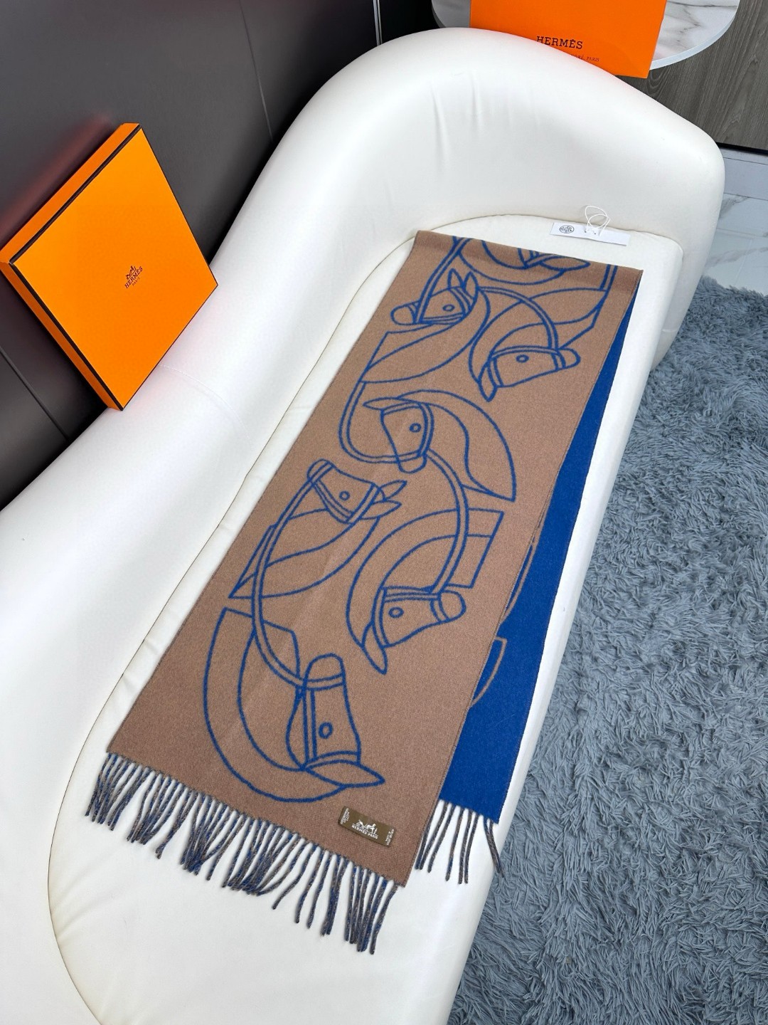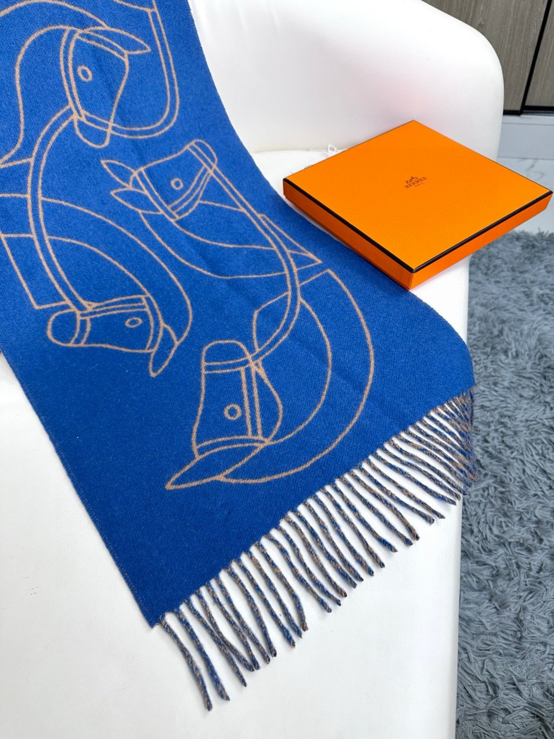 This new Hermes scarf features a delicate color-blocking jacquard weaving, presenting the Entrelacs Equestres horse head pattern designed by Geoff McFetridge. The size is 40*195CM