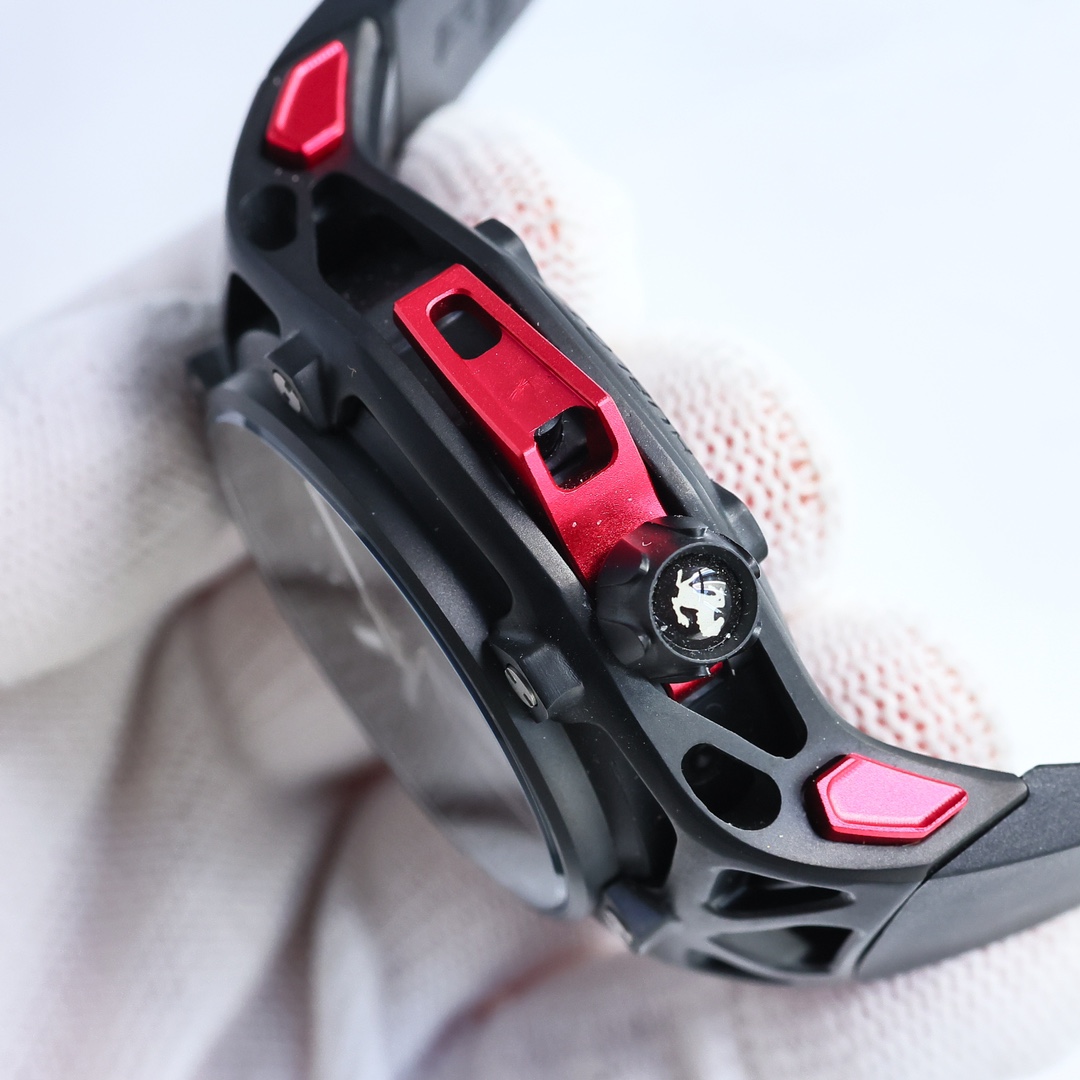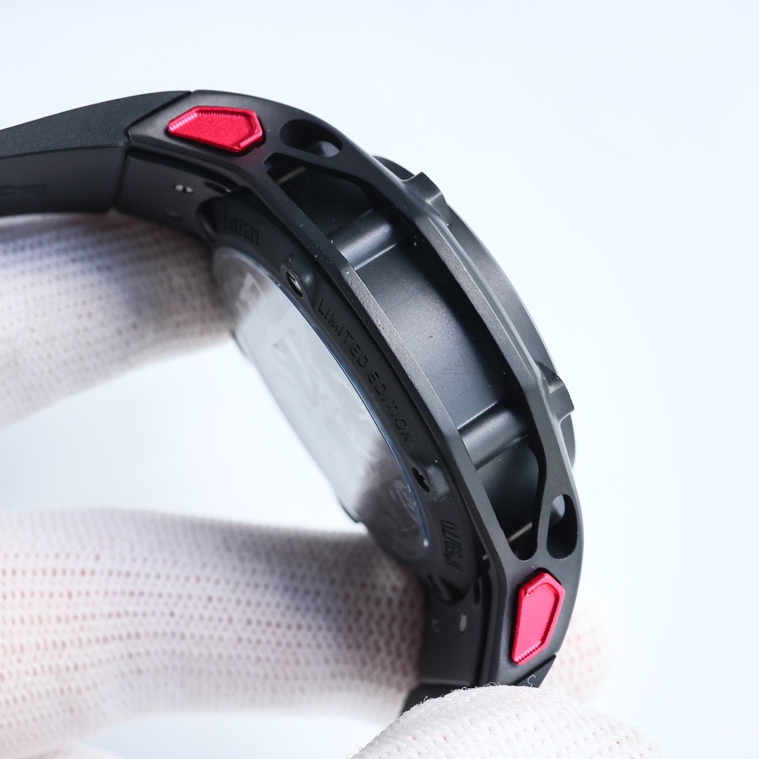 Ferrari The latest updated HUBLOT ???JR4 Techframe Ferrari 70th Anniversary Tourbillon Chronograph. The watch is designed based on Ferrari's creative process for developing sports cars. Inspired by the "engine" - the movement, free inspiration is freely expressed around this core. The crown is at 4 o 'clock, with a black PVD titanium insert on ??. The horizontal buttons are also presented in the famous Ferrari red, perfectly showcasing the Starlight Supreme. Automatic fully automatic winding machine ?? Diameter :43mm thickness :12mm?? ?? Best luxury gift recommendation ?? Please recognize exclusive quality ??