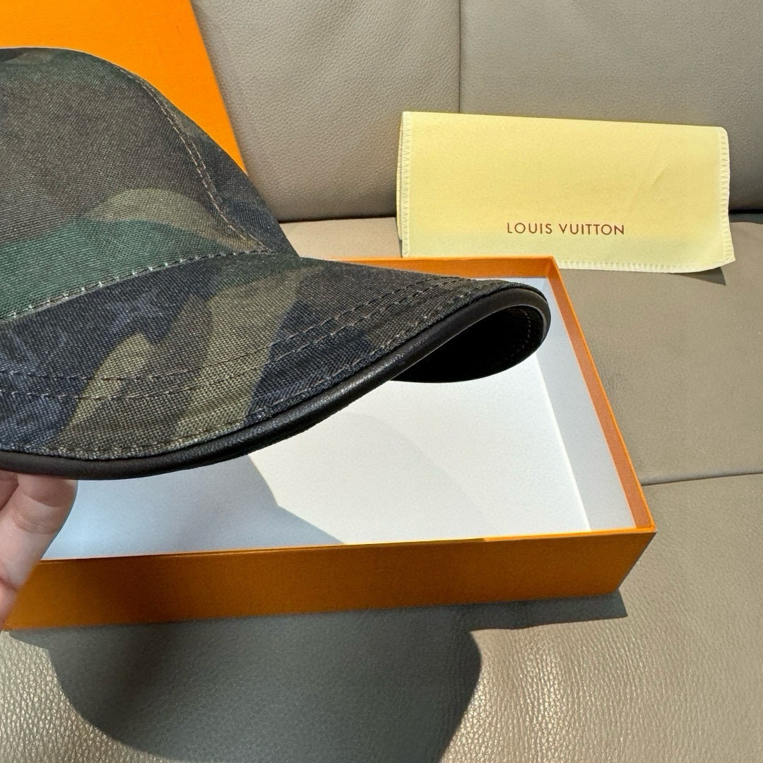 With a box and cloth bag, the new original single baseball cap from LV(Louis Vuitton), camouflage LV, 1:1 mold custom-made at the counter, original canvas material + top-grain cowhide, light and breathable! The quality is superb. The basic head circumference is 56, and the patch is adjustable.
