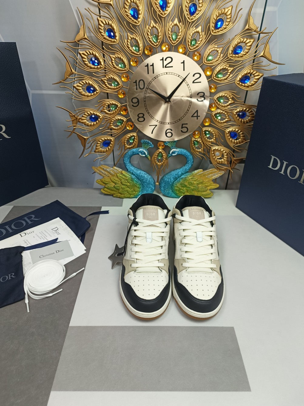 ???? Dior B57 blockbuster ?????? Spring 2014 Men 's collection Reinterpreting the design of basketball shoes, it has become a classic item of Dior. Crafted from black and cream white smooth cowhide, paired with beige suede, the leather CD logo is displayed on the side. The tongue, sole and rear side of the shoe are decorated with various distinctive details to enhance the style, while the perforated details, stitching and rubber inserts further highlight the dynamic charm of its sporty style. It features a two-tone rubber sole that can be matched with various outfits to create an exquisite look. ?? Black and cream-colored smooth cowhide paired with beige suede ?? features a beige and black Oblique printed CD logo on its side ?? The tongue is adorned with the Dior B57 logo ?? The heel is decorated with the CD logo ?? Chinese Helper ?? With padded upper ?? Tie opening with two-tone CD logo hole ?? Toe hole details ?? Mesh fabric lining ?? White and grey rubber outsole with Dior logo ?? Side stitching splicing structure ?? give a pair of cotton shoelaces
